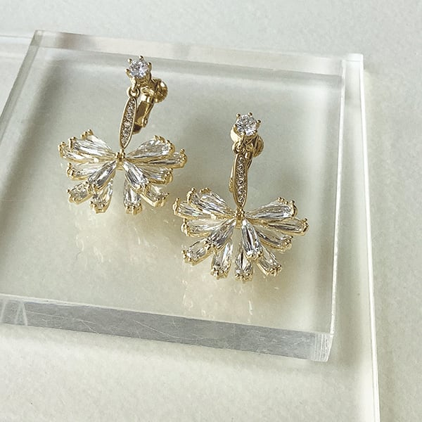 キュービックジルコニアの輝きが美しいイヤリングまたはピアス。細長いペアシェイプのジルコニアを花びらのように配置した上品なデザイン。エタンセル(フランス語できらめきという意味)の名にふさわしく、日常使いから特別なシーンまでコーデを煌めかせるジュエリーです