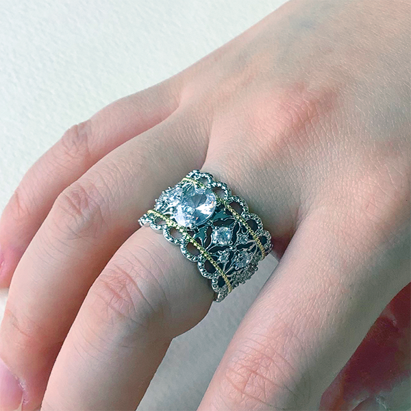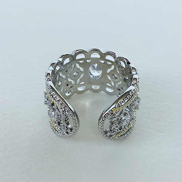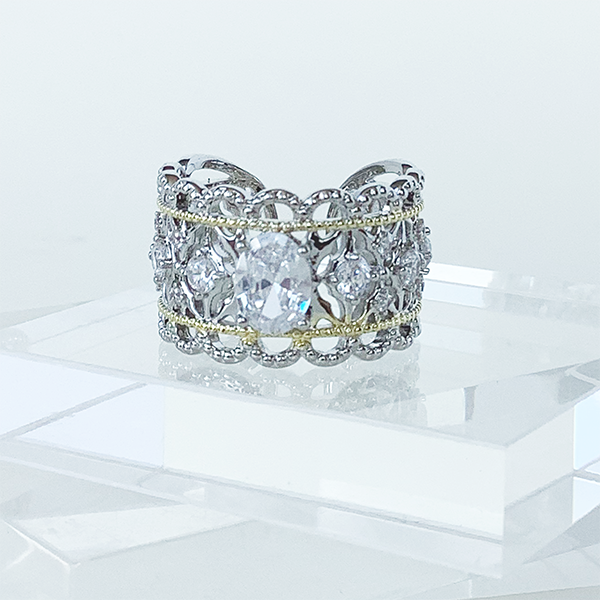 エレガントなレース調のリング。中心にオーバルシェイプのキュービックジルコニアをあしらい、存在感のあるデザインに仕上げました