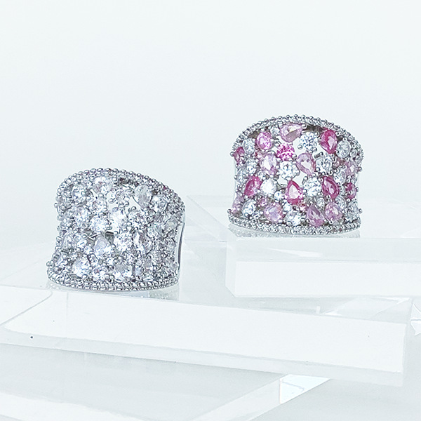 キュービックジルコニアを盛りだくさんにセットしたボリュームのあるリング。存在感のあるデザインが指元をゴージャスに彩ります