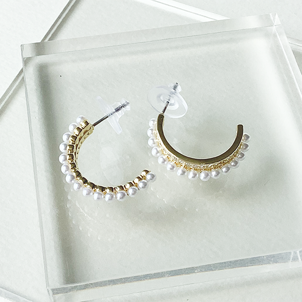 シンプルながらも存在感のあるイヤリングまたはピアス。キュービックジルコニアと樹脂パールをあしらった、2ラインのデザインです