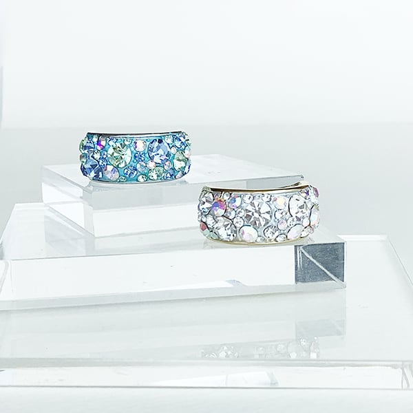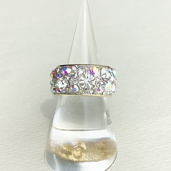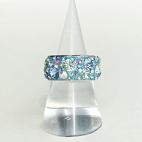クリスタルガラスをふんだんにあしらったリングです。ランダムな配置が生み出す光の表情が、指元に華やぎと存在感をもたらします