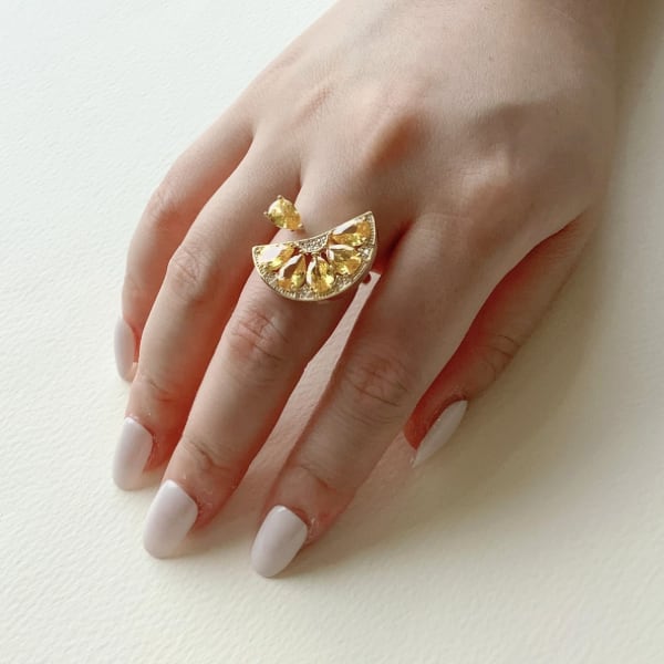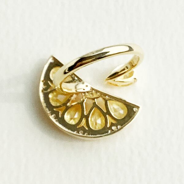 みずみずしいレモンをモチーフにした、キュービックジルコニアがきらめくリングです。フレッシュなくし切りのレモンモチーフが、指元に爽やかな彩りを添えます
