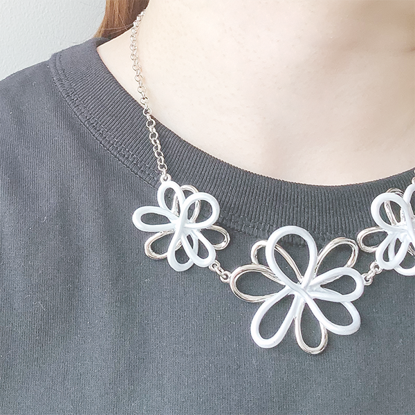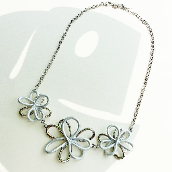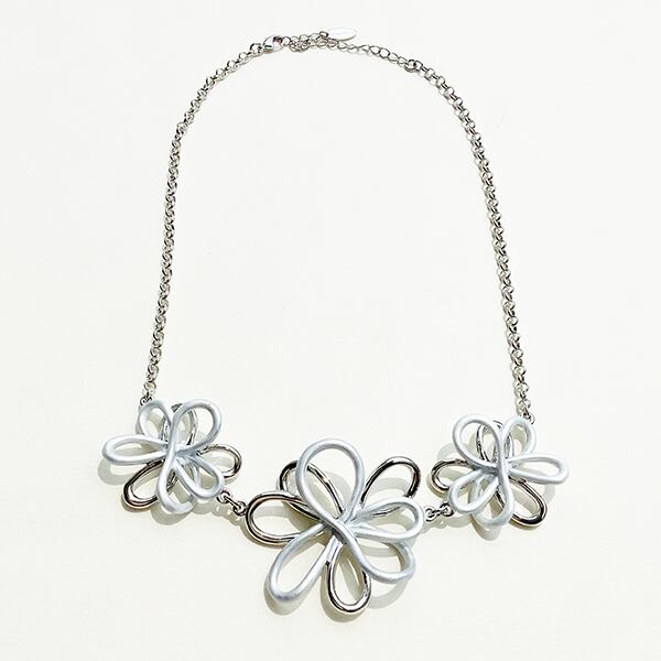 3輪のお花のモチーフが連なったネックレスです。2トーンの色使いがデコルテを優しく引き立て、存在感のあるデザインが装いに華やぎを添えます