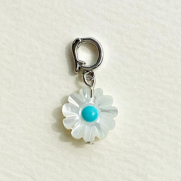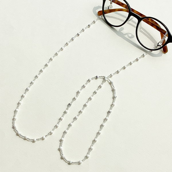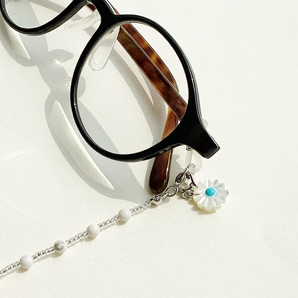 フラワーチャームが揺れるメガネチェーン。シンプルなチェーンとしても、チャームを付けてネックレスとしても楽しめます