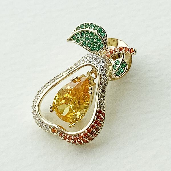 みずみずしい洋梨モチーフのタックピン。胸元や襟元、帽子などに華やかなアクセントを。キュービックジルコニアの輝きが、装いをさりげなく格上げしてくれます