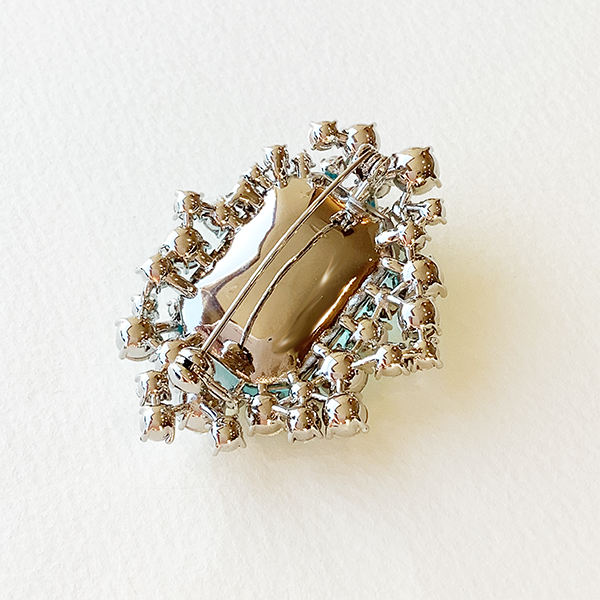 アクアマリンのような美しい色合いのクリスタルガラスがきらめくブローチです。大粒でボリューム感があり、コーディネートに華やぎをプラスします