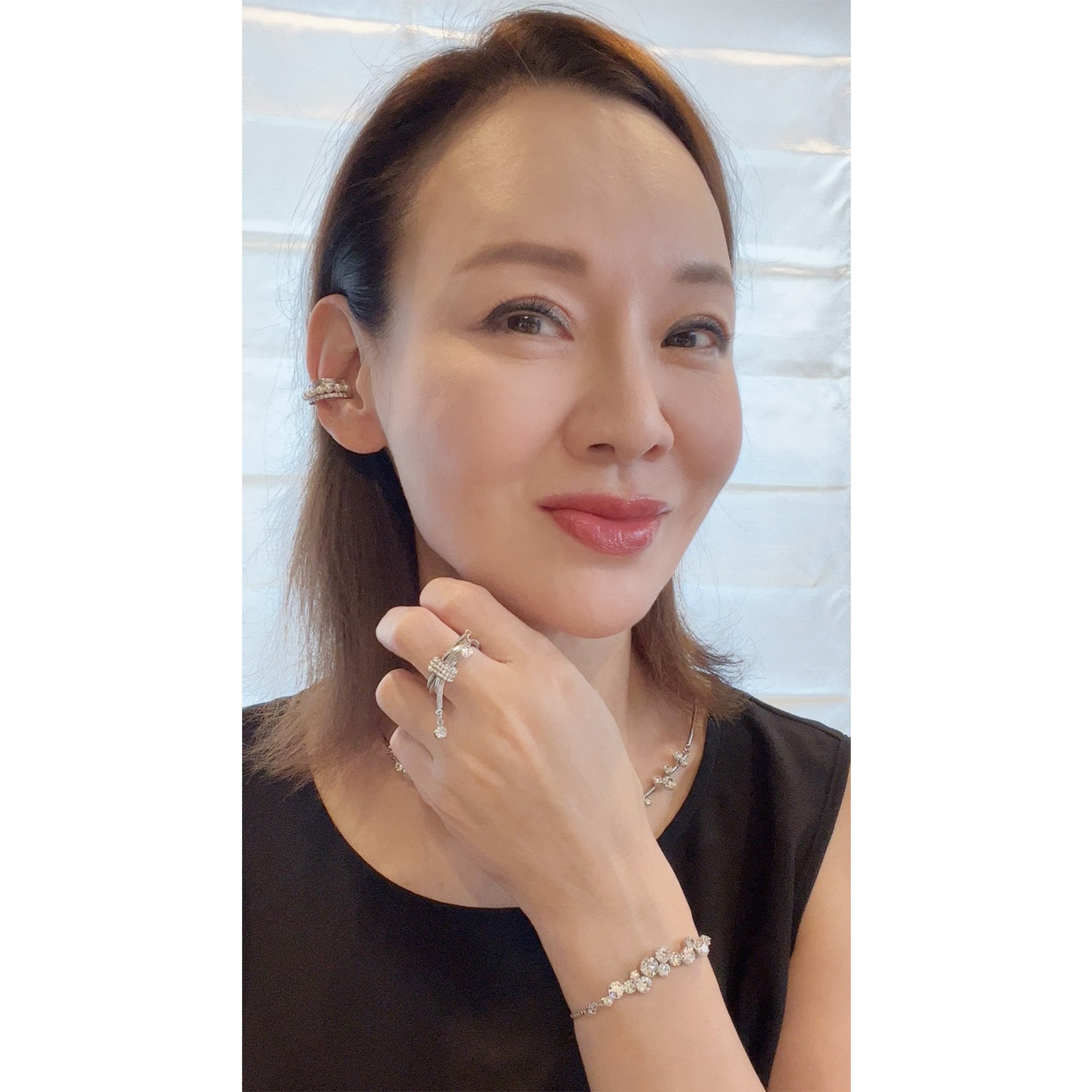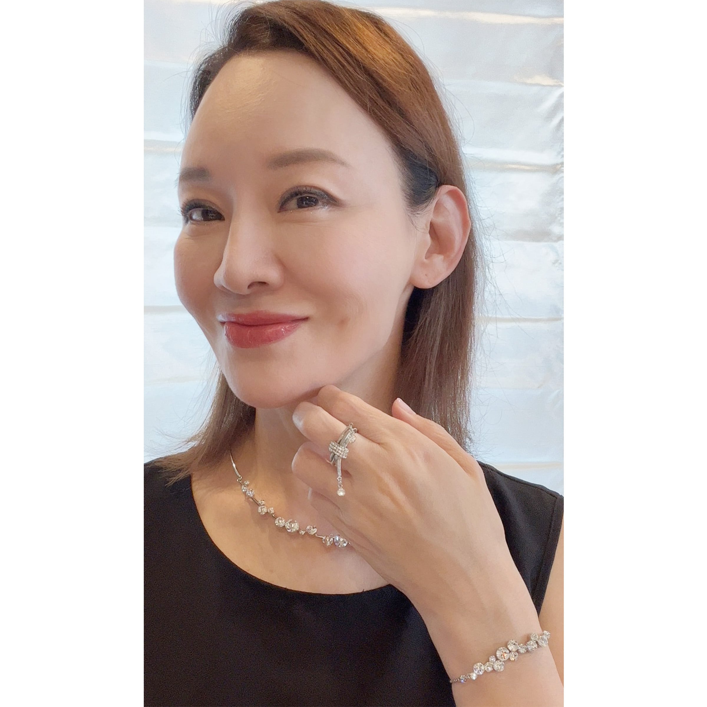 チェーンを数周コイル状に巻きつけた、指に合わせてサイズ調節できるフリーサイズリング。25石以上のクリスタルガラスを贅沢にあしらい、お手元に上質な輝きをプラスします。まるでリボンのようなイメージで様々な表情をお楽しみください