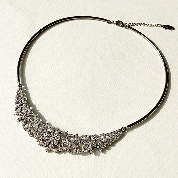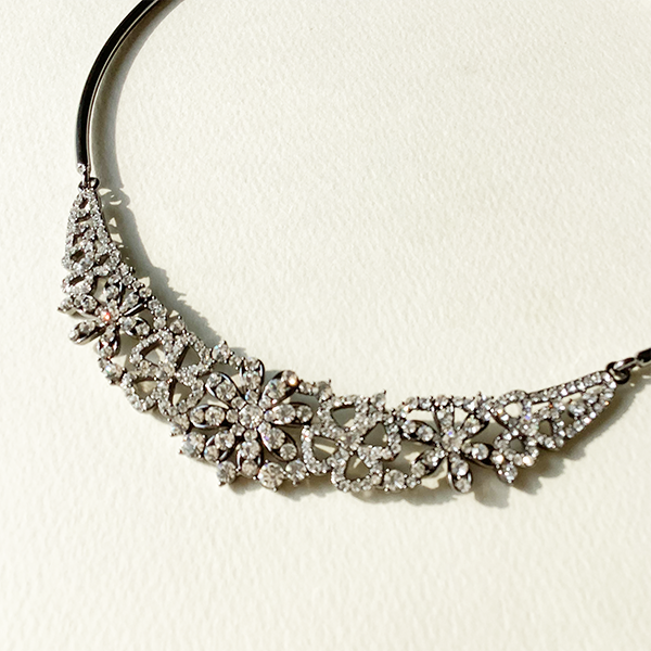 チョーカータイプのネックレス。繊細なレース調のお花模様が首元を優しく包み込み、デコルテに上品な華やかさを添えてくれます