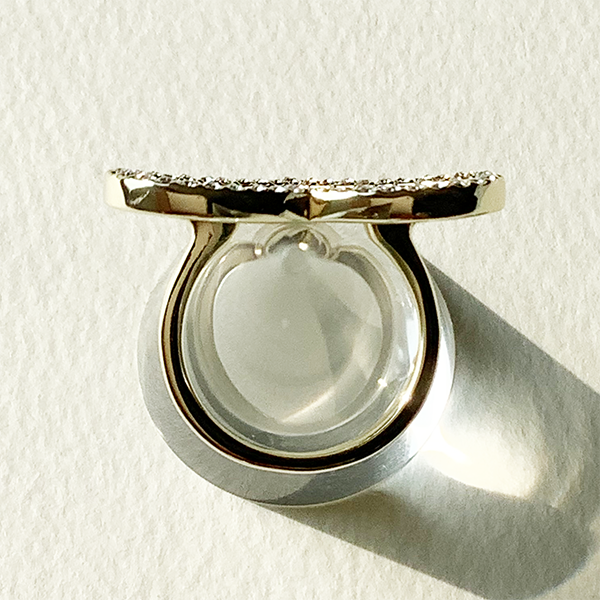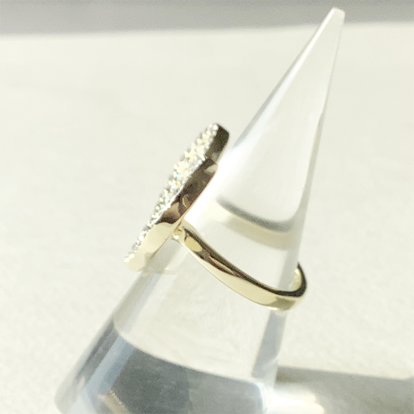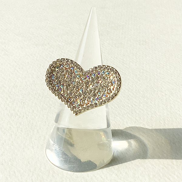 ハート型のフォルムが目を引くリングです。表面にちりばめられたクリスタルガラスが、フェミニンで華やかな印象を添えます