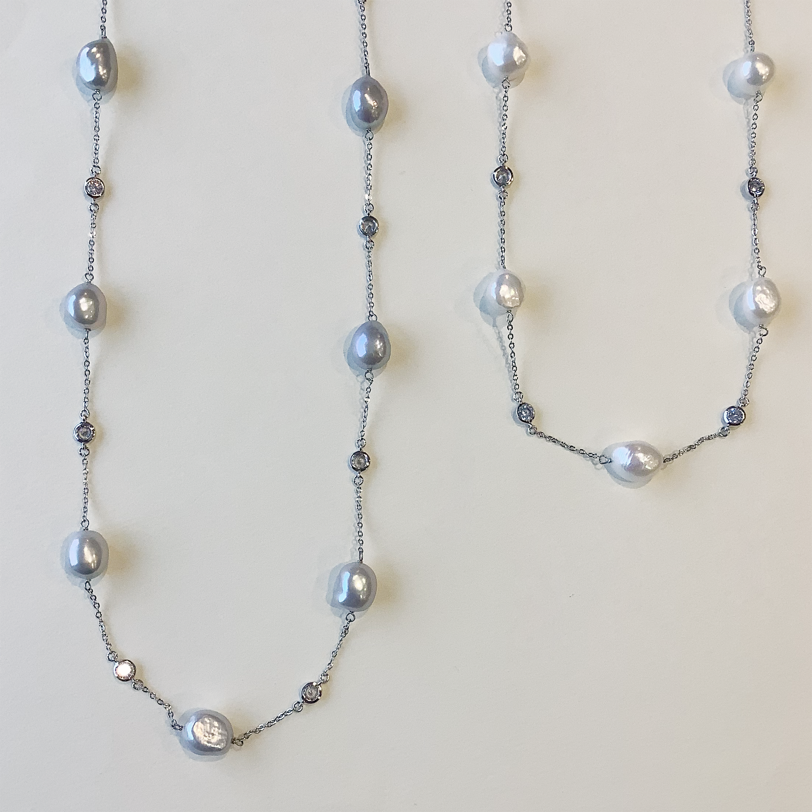 大粒の淡水パールとキュービックジルコニアをあしらった、ステーションタイプのロングネックレス。淡水パールの間にキュービックジルコニアを配し、パールの艶とキュービックジルコニアのきらめきが楽しめるデザインです