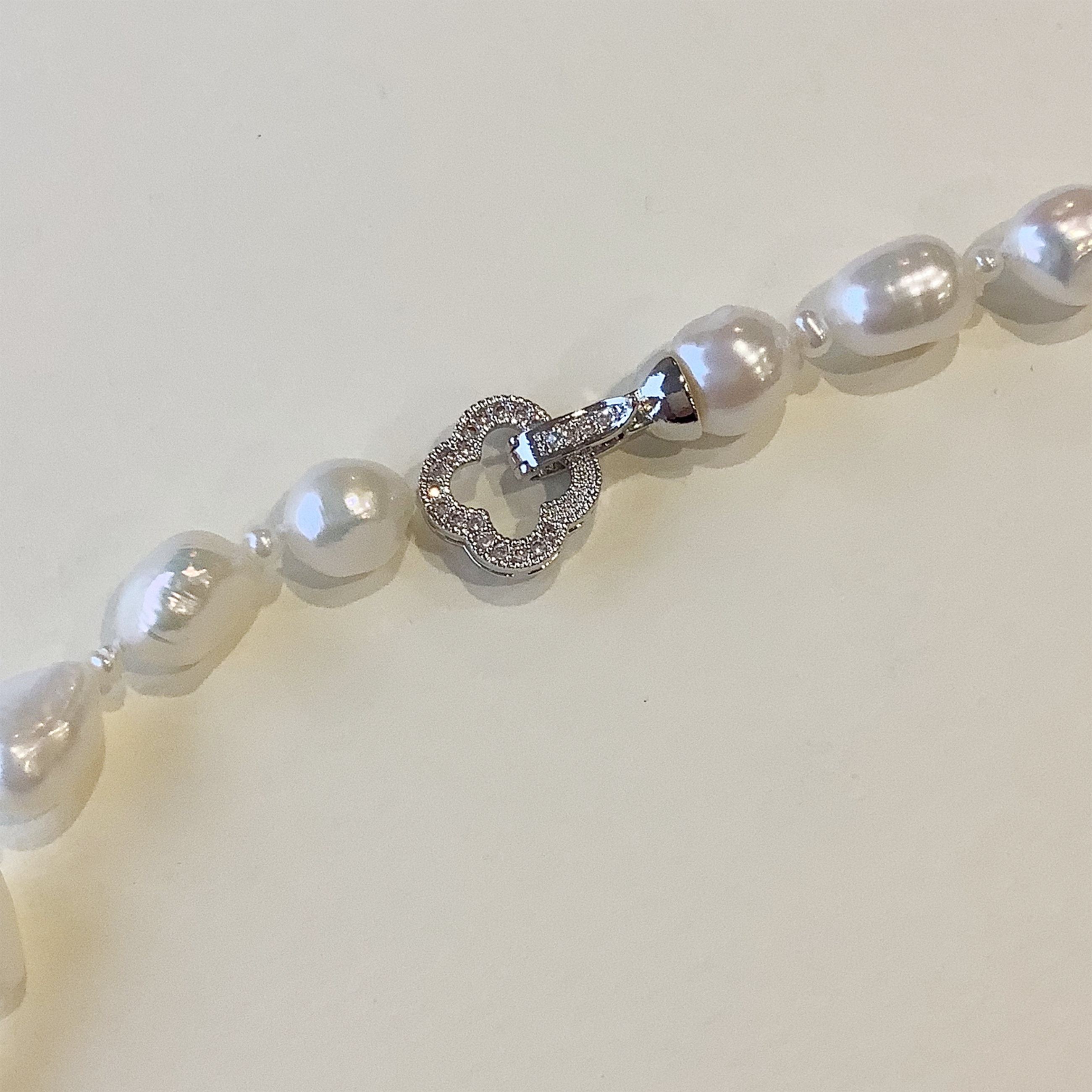 エレガントさがありながら、バロックパールで表情豊かなデザインに。留め具のキュービックジルコニアが、さりげないアクセントになっています