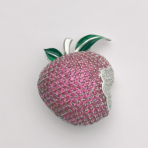 ピンク系のキュービックジルコニアが果実の瑞々しさと艶やかさを表現。かじられた部分のクリアキュービックジルコニアとの美しいコントラストを生み出しています