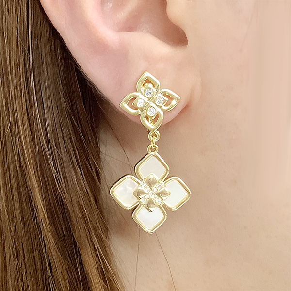 天然シェルのしっとりとした艶と、キュービックジルコニアの繊細な輝きが重なり合う、二層構造のイヤリングまたはピアス。上部には小粒のジルコニアを埋め込んだゴールドカラーフラワー、下部には柔らかな光を放つシェル素材の花びらにゴールドカラーの小花を重ねています。動くたびに光を受けて表情を変え、華やかでフェミニンな印象を演出します