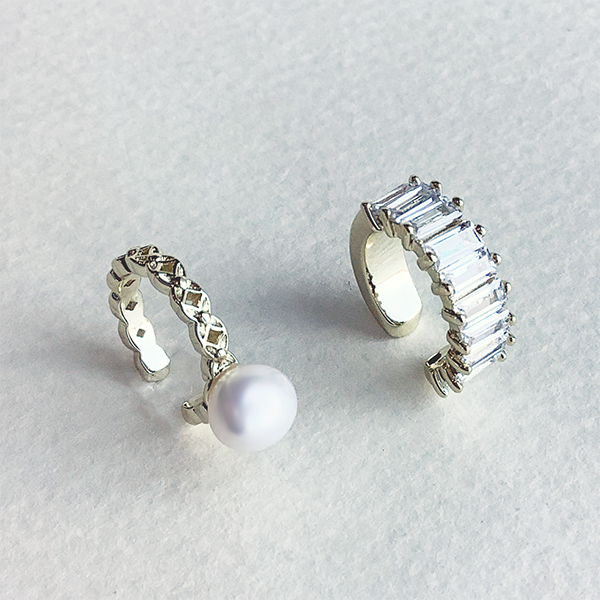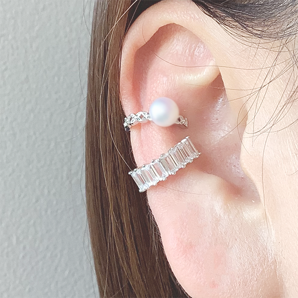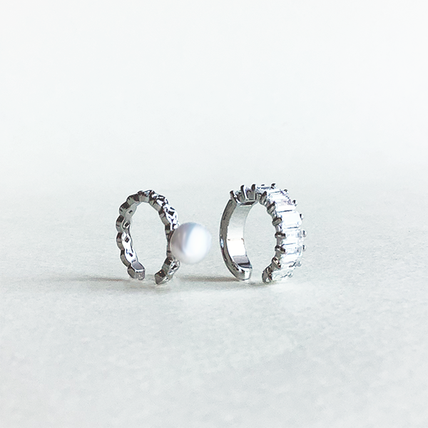 繊細な輝きと構築美が耳元を彩る、イヤーカフの2種セット。 ひとつは、艶やかな淡水パールを主役に据えたクラシカルなデザイン。もうひとつはバゲットカットのキュービックジルコニアを連ねたモダンなラインです