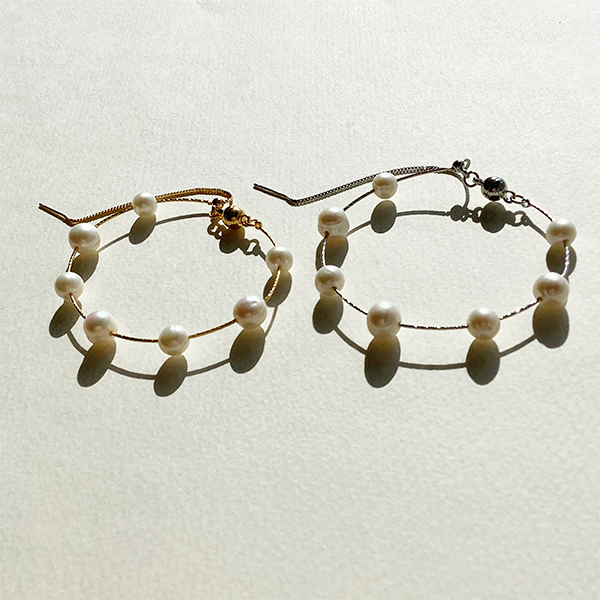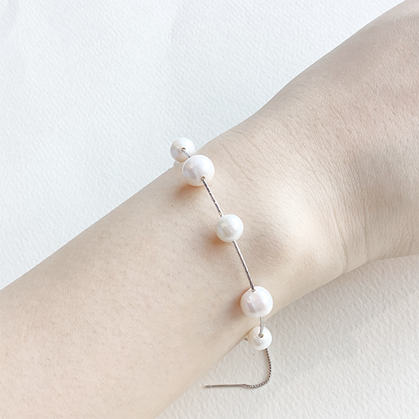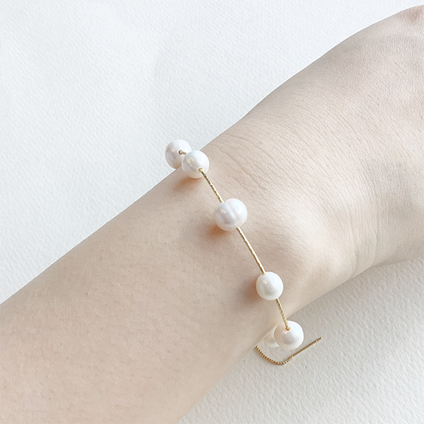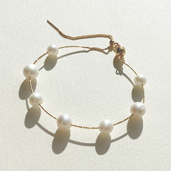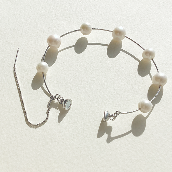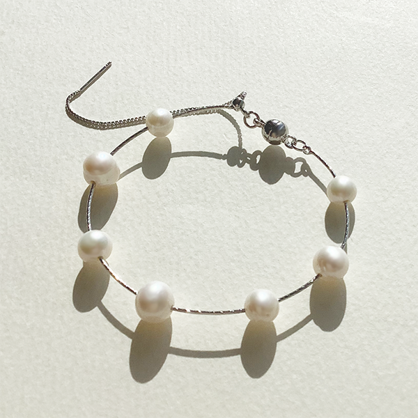 繊細な美しさと洗練されたミニマルデザインが魅力のブレスレット。7粒の淡水パールを極細ワイヤーに並べ、自然なフォルムと柔らかな光沢が手元に上品さを添えます。マグネット式クラスプで着脱も簡単。カジュアルにもフォーマルにも馴染む、タイムレスな一本です