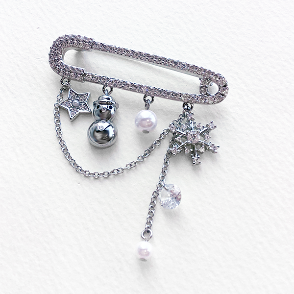 セーフティピン型のデザインブローチ。シルバートーンのピン本体には細かいラインストーンが敷き詰められ、光を受けて繊細に輝きます。4つのチャームが吊り下げられ、冬の装いに個性と華やかさを添えます