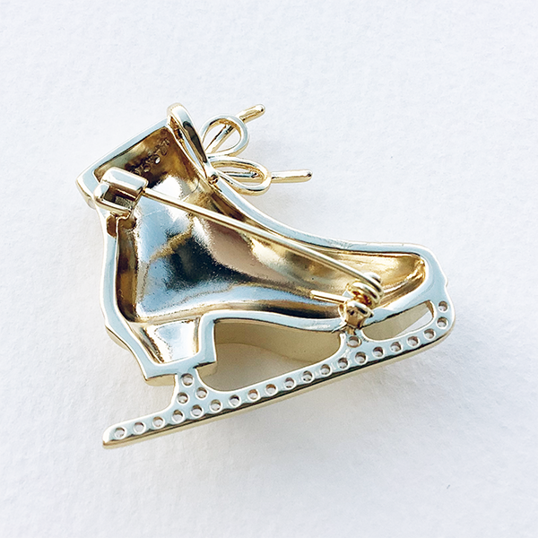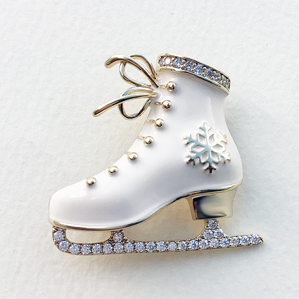 冬の煌めきを纏う、アイススケートブローチ。 繊細なホワイトカラーコートで仕上げられたスケートシューズに、ゴールド色のシューレースと雪の結晶モチーフが華やかさを添えています