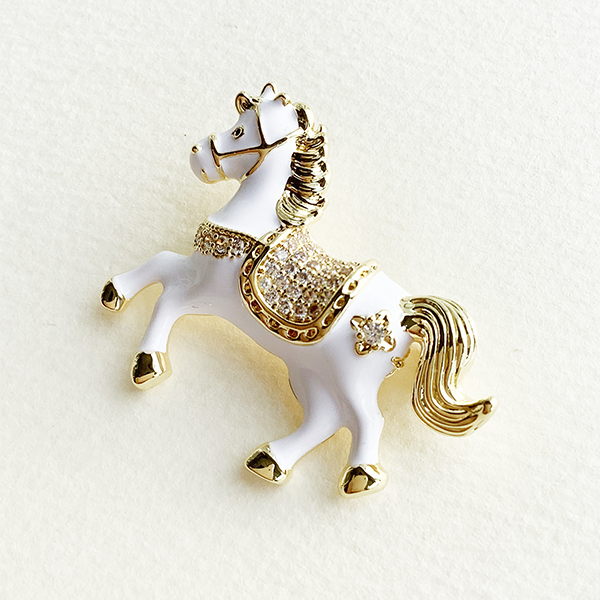 ホワイトとゴールドカラーが美しく映えるポニーのブローチです。繊細なキュービックジルコニアが、優雅な立ち姿に上品なきらめきを添えます