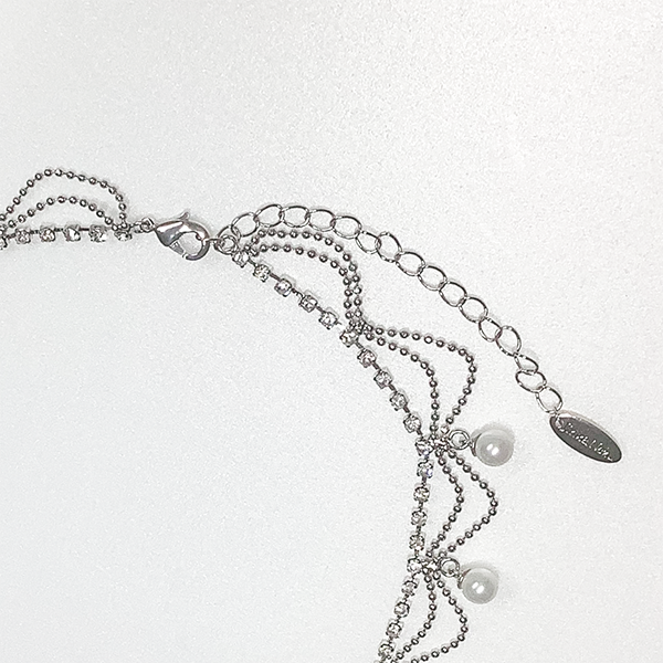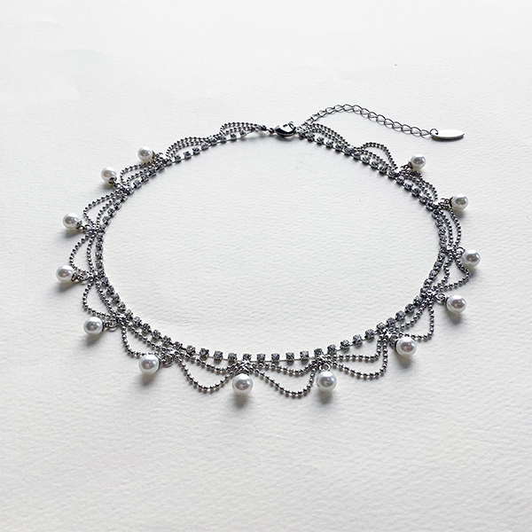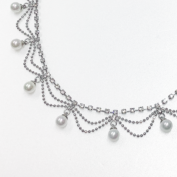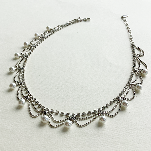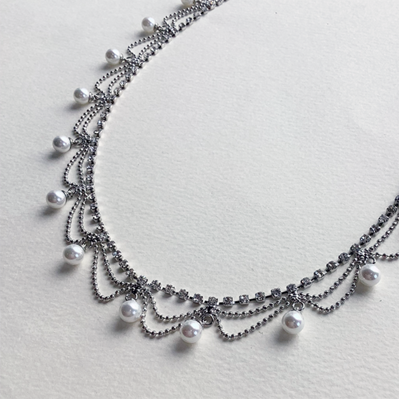 フォーマルシーンに映えるレイヤードデザインのパール調ジュエリー。複数のシルバートーンチェーンに樹脂パールをリズミカルにあしらい、動くたびに柔らかな輝きを放ちます