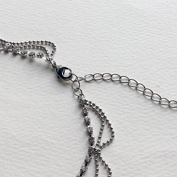 クラシカルな品格と繊細な装飾性を兼ね備え、ガラスの煌めきやドレープの美しさと揺れ感が、首元に上品な華やぎを添えるデザイン。装いに合わせるだけで、洗練された印象を与えてくれます