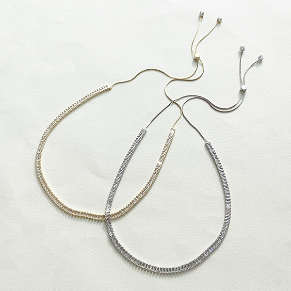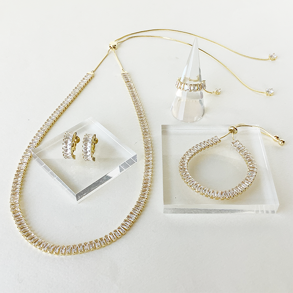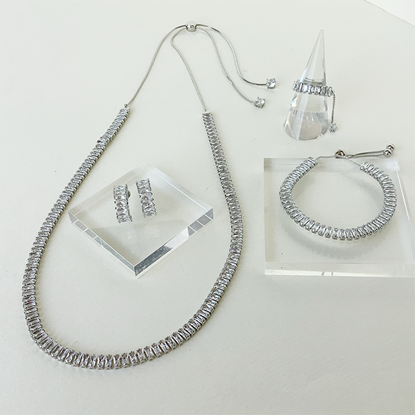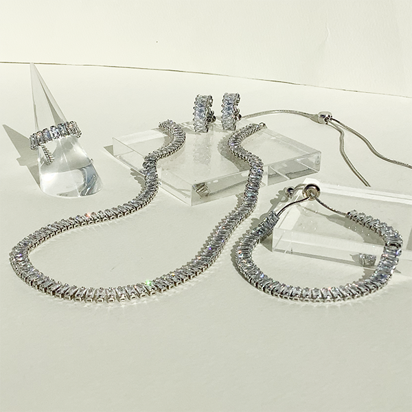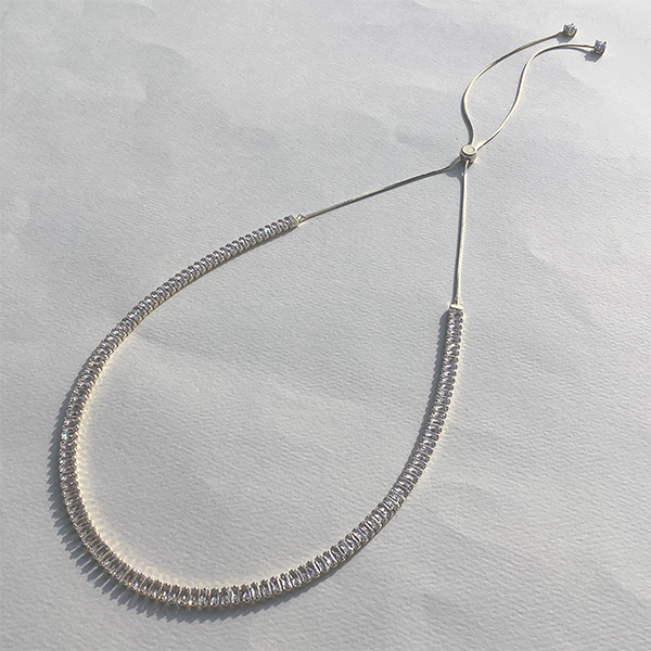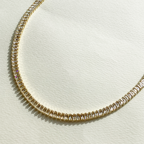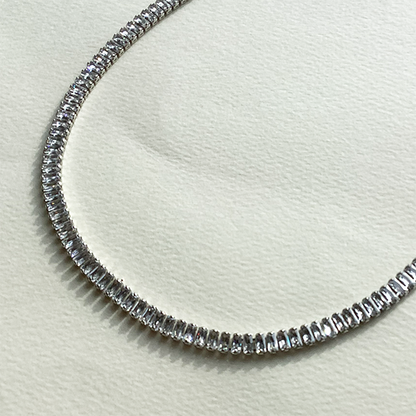 バゲットカットのキュービックジルコニアを連ねたネックレス。モダンかつクラシカルな雰囲気で胸元を飾ってくれます