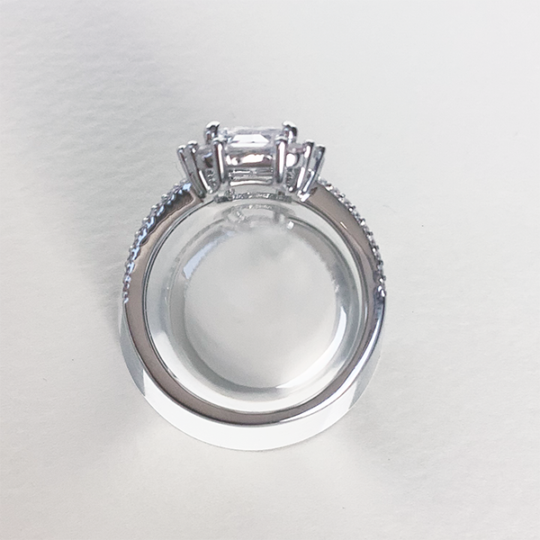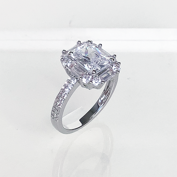 お手元に圧倒的な存在感と繊細な煌めきを。オクタゴンカットの大粒キュービックジルコニアをセンターに配し、周囲にはラウンドカットとバゲットカットのキュービックジルコニアを贅沢に配置した立体的なデザインです