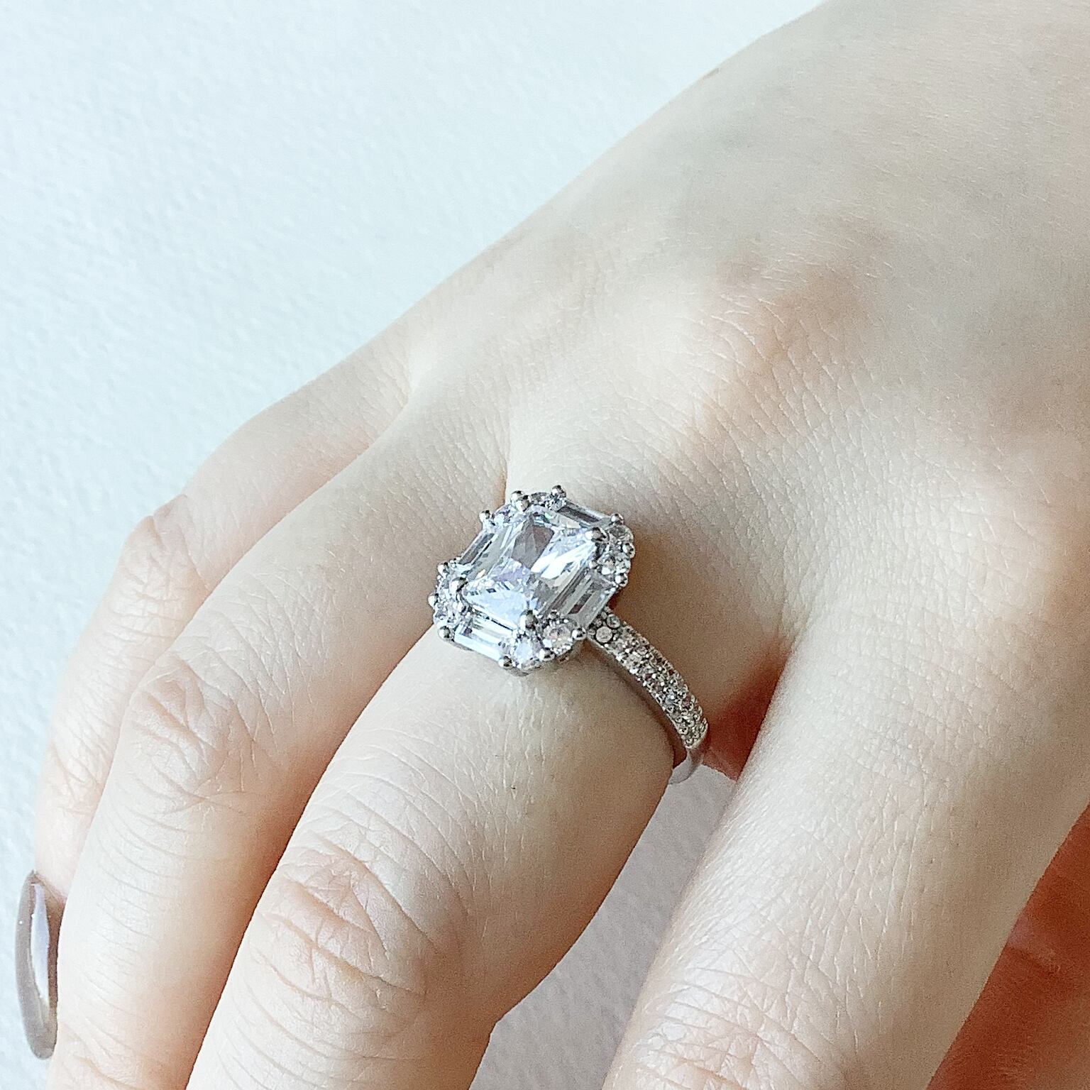 キュービックジルコニアを45石以上使用。リングアームにも小粒のキュービックジルコニアを敷き詰め、どの角度から見ても華やかに。細部までのこだわりを感じながら、センターストーンの輝きをさらに引き立てます