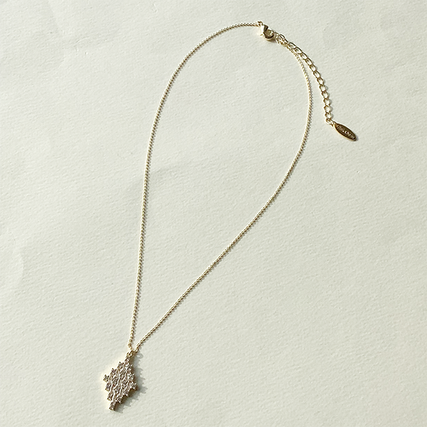 バゲットシェイプ、ラウンドシェイプのキュービックジルコニアを組合せて、ダイヤ形(ひし形)に仕立てたペンダント。光を受けるたびにキラキラと輝き、胸元を華やかに演出してくれます