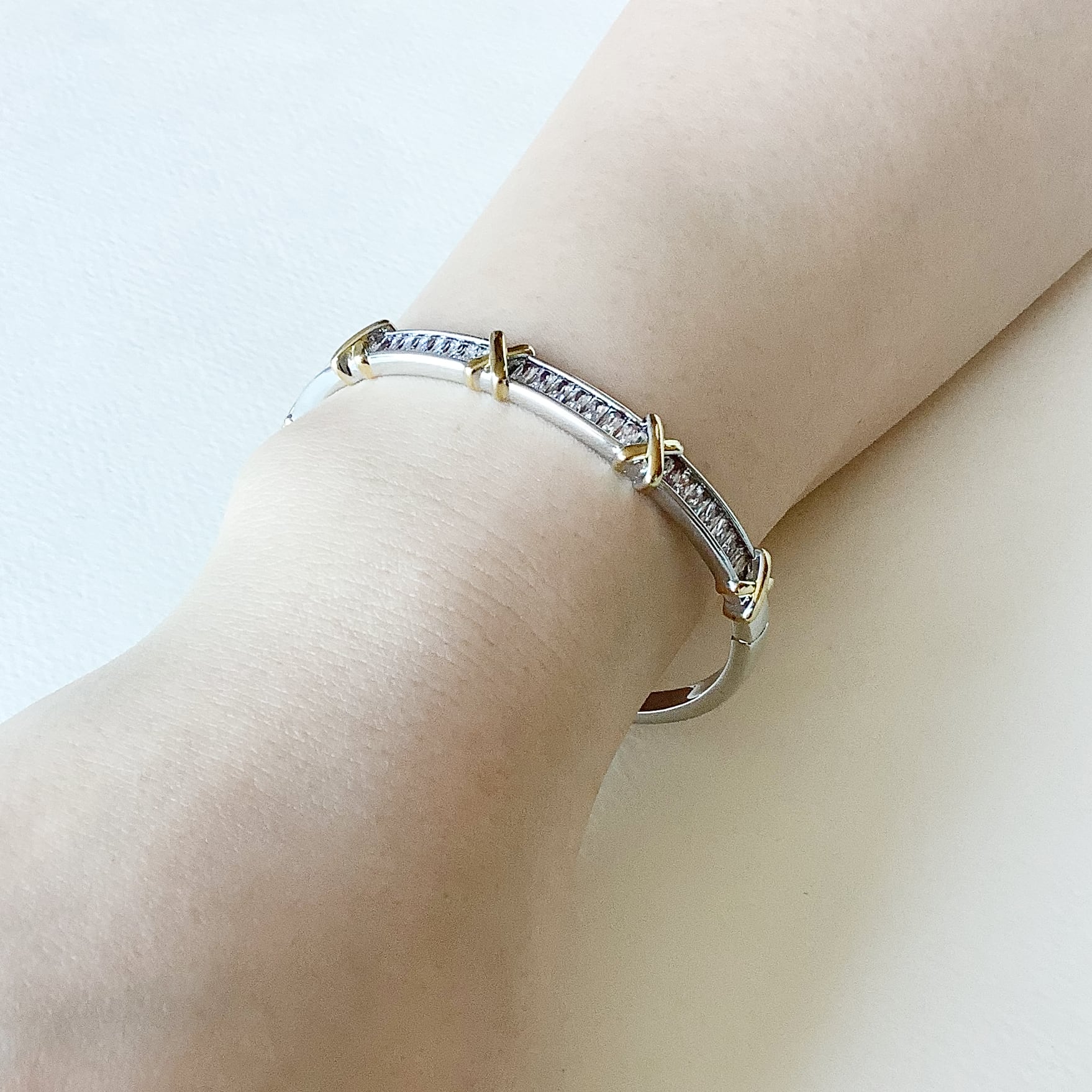 繊細なバゲットカットのキュービックジルコニアがシルバートーンの地金に美しく並び、ゴールドトーンの「X」モチーフがアクセントに。クラシックでありながらモダンな印象を演出します