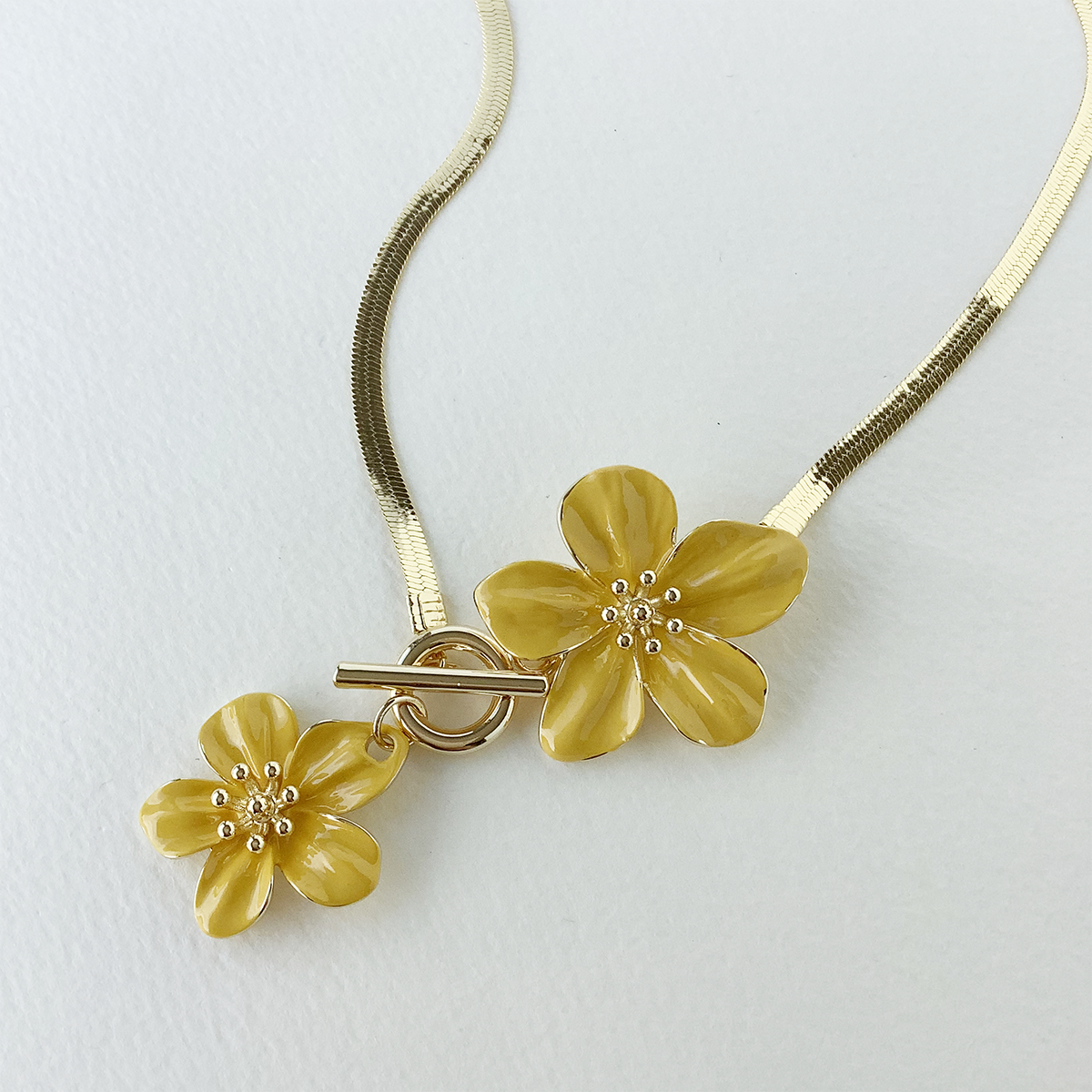 サンライトイエローのやわらかな色合いが目を引くネックレス。フラワーモチーフの存在感が印象的で、艶のあるゴールドカラーのフラットチェーンが肌に沿い、洗練された輝きを添えます。花びらの立体感や玉状の装飾が本物の花のような美しい表情を見せます