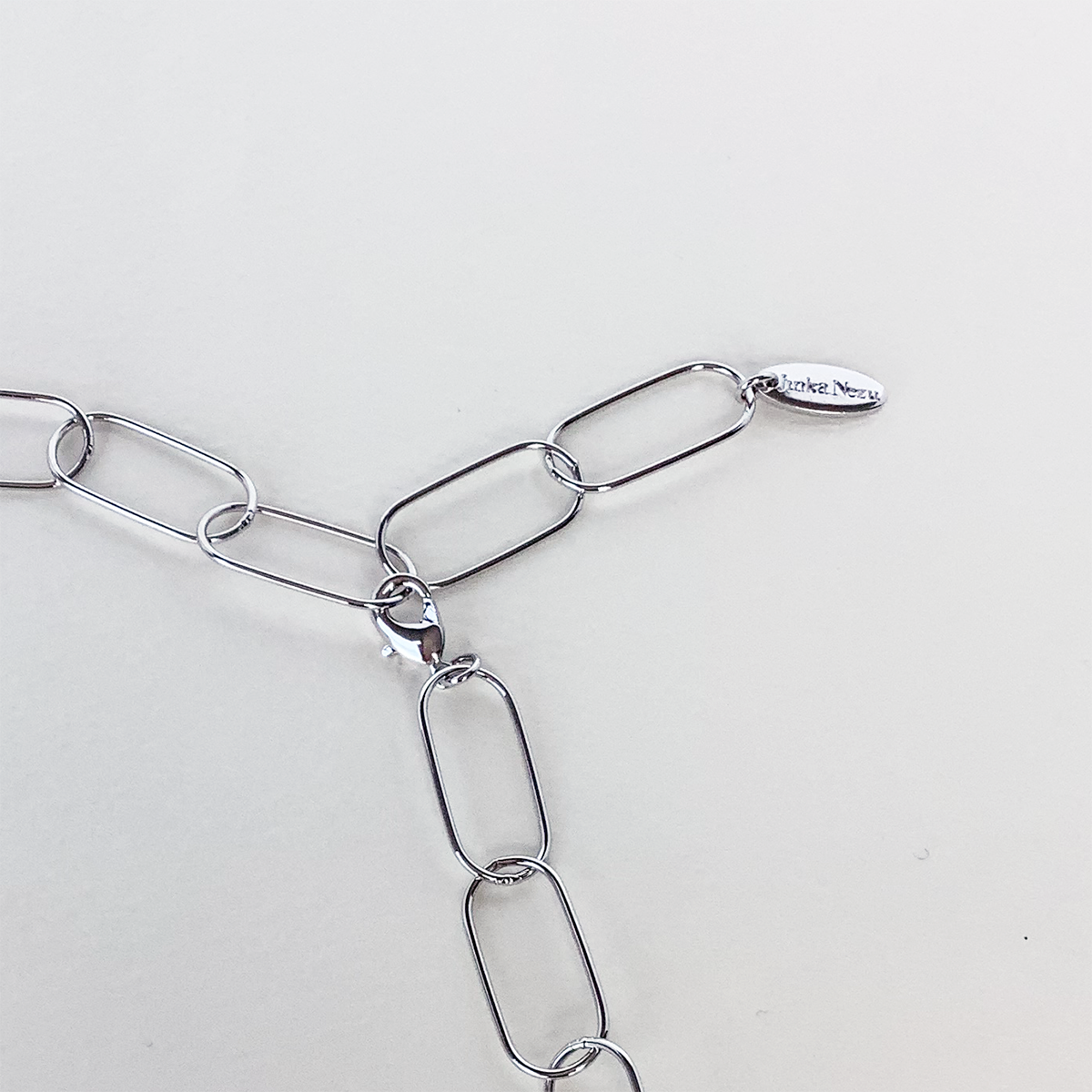シルバーカラーのオーバルチェーンが全体を引き締め、モダンな印象に。軽やかな着け心地で、単品使いはもちろん、重ね付けもおすすめです