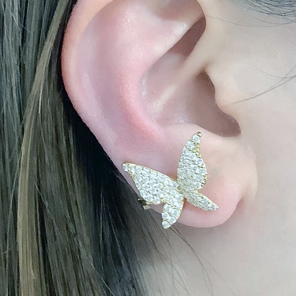キュービックジルコニアを蝶の羽部分にぎっしりと敷き詰めており、耳元を華やかに彩るイヤーカフに仕上がりました。顔回りがぱっと明るくなる存在感のあるイヤーカフです。