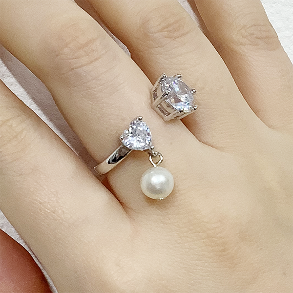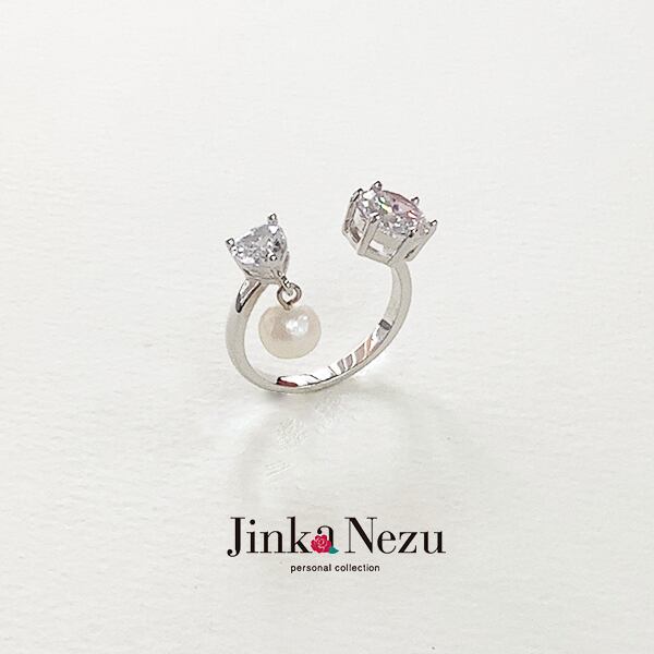 〇ボリュームのあるラウンドのキュービックジルコニアが存在感のあるキラメキを放ち、揺れる淡水パールとハート型のキュービックジルコニアがかわいらしさを演出する華やかなリングです。