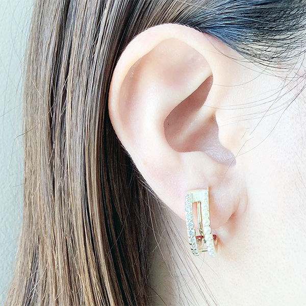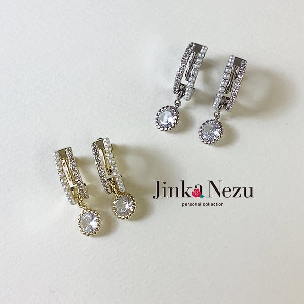 フープに掛けるチャームは、キュービックジルコニアのラウンドシェイプがベゼルセッティングされたもの。動くたびにキラキラ揺れて目を惹きます。シルバーカラーとゴールドカラーの2タイプをご用意しました