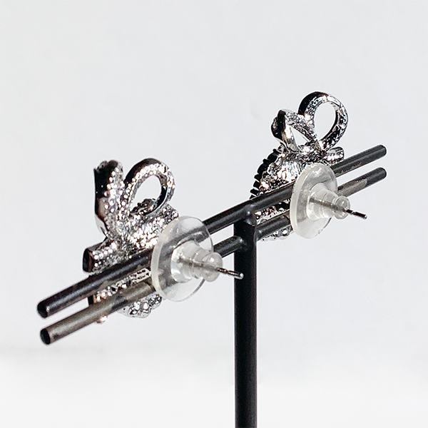 クリスタルガラスが品よく映えるエレガントなイヤリングまたはピアス。1石のクリスタルガラスの周囲をクリスタルガラスで取り巻き、さらにリボンの装飾で華やかに仕上げました