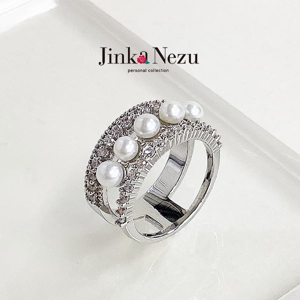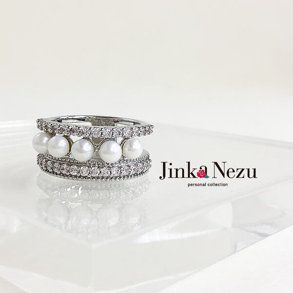 淡水パールとキュービックジルコニアがそれぞれライン状に並んだシンプルデザインながらもエレガントなリングです。