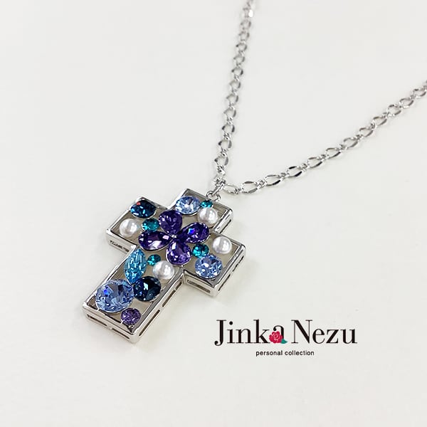 〇パープル系~ブルー系のクリスタルガラスで纏めたカラフルで可愛いクロスペンダントです。