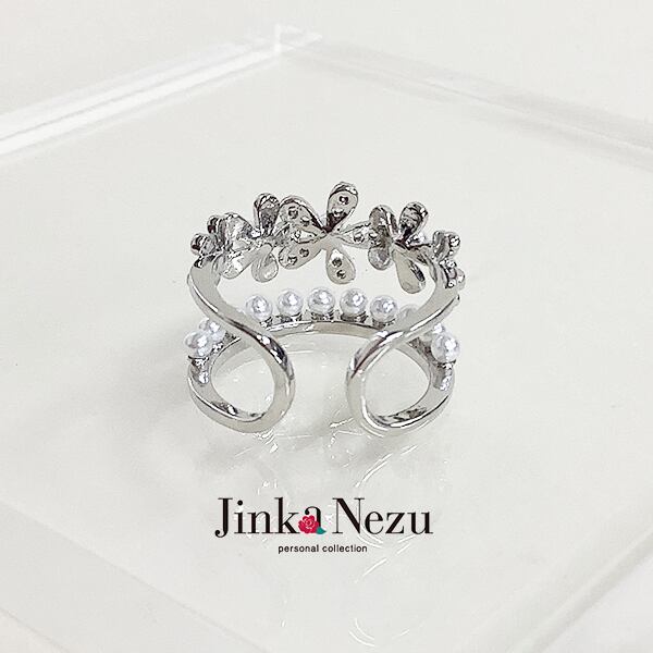 〇小花がキュービックジルコニアと樹脂パールの上に可愛く乗っているように見えるリングです。