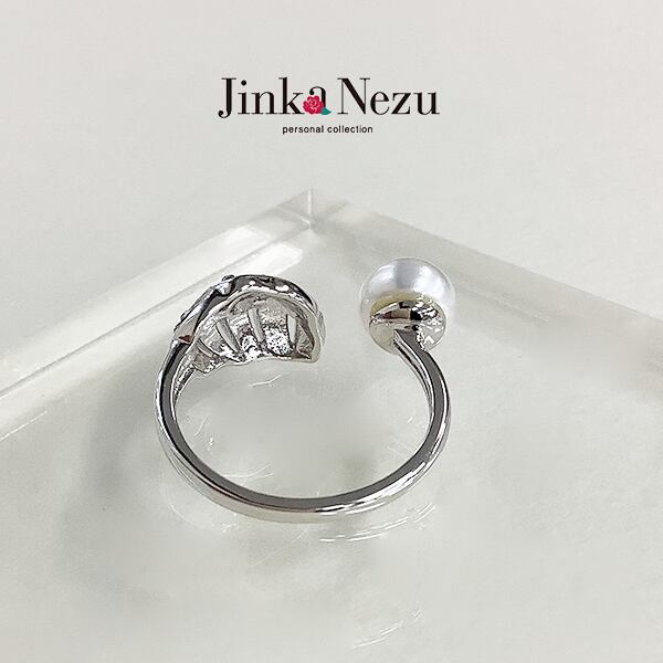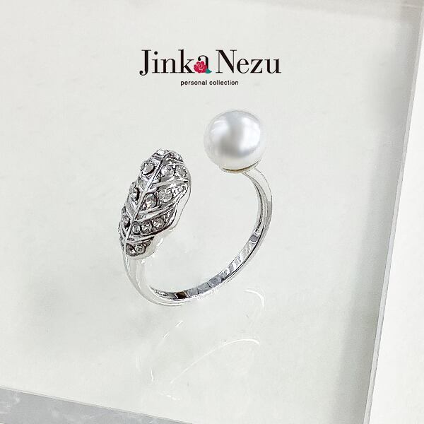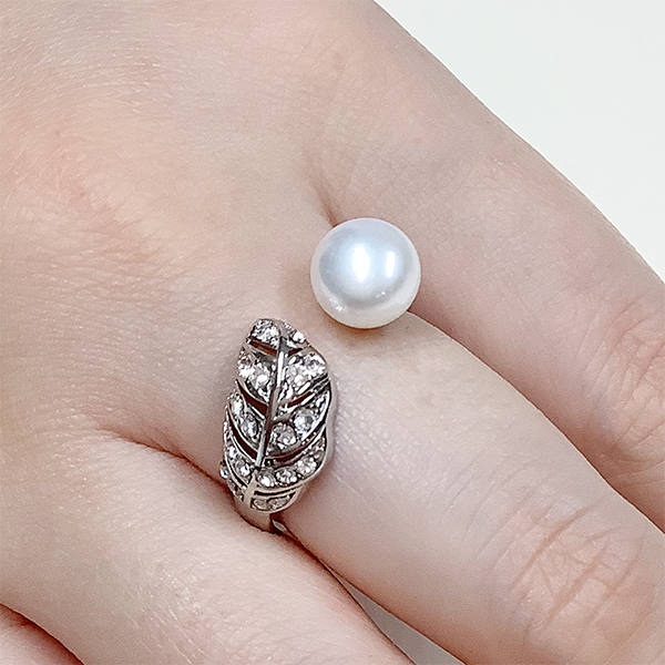 〇フェザーモチーフのリングにクリスタルガラスを散りばめ淡水パールをアクセントにしたリングです。指先を豪華に彩ります。