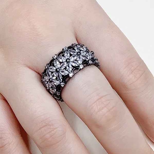 〇マーキスカットのキュービックジルコニアを花びらに配したフラワーリングです。キュービックジルコニアのきらめきとブラックカラーのリングが相まって綺麗なフラワーリングに仕上がっております。