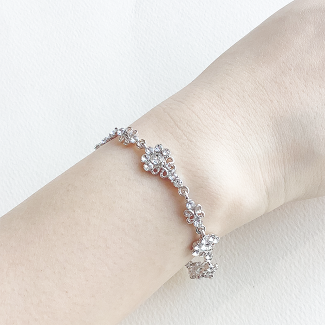 〇キラキラのクリスタルガラスを使った、オリエンタル風デザインのキュートなブレスレットです。クリスタルガラスがスイングしながら華麗に腕元を彩ります。