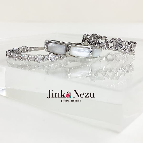 〇軽やかでキュートなハートリング、スタイリッシュながらエレガントなシェルリング、そして繊細に輝きを放つキュービックジルコニアリングの豪華3本セット。