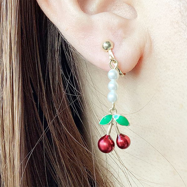 可憐なさくらんぼをモチーフにしたイヤリングまたはピアス。樹脂パールを連ねることで、エレガントさもプラスしてくれます