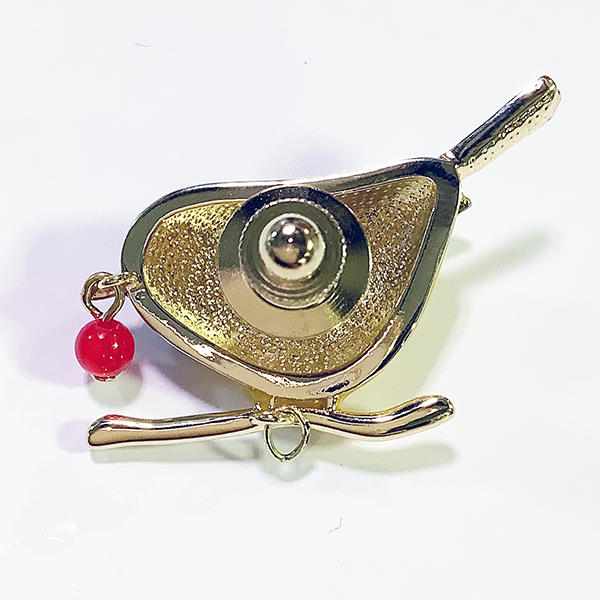 ムクドリがヤマモモをついばんでいるデザインのタックピン。カラフルにデフォルメしたムクドリの可愛らしさと、ヤマモモの赤い実を表現されたデザインです