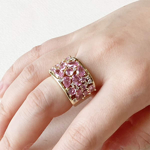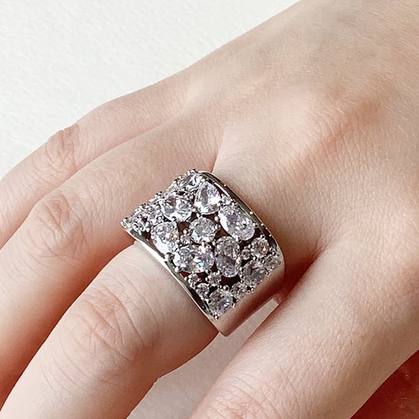様々なシェイプのキュービックジルコニアを惜しげもなく敷き詰めたリング。ボリューム感がありながら、軽やかに着用できます