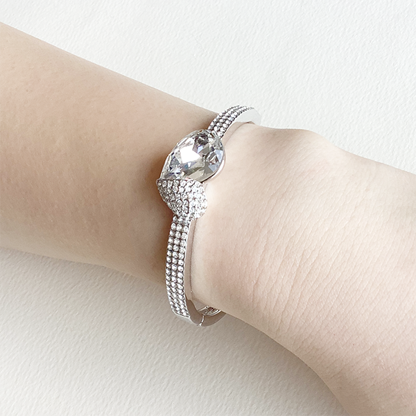 〇クリスタルガラスのペアシェイプを用いてアシンメトリーのハートモチーフに作り上げたゴージャスなバングルです。キラキラととても華やかに彩ります。