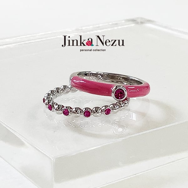 クリスタルガラスをセットした、樹脂カラーのリングとボールデザインのリングの2本セット。ポップな色合いとシンプルな形がおしゃれな指先を演出します