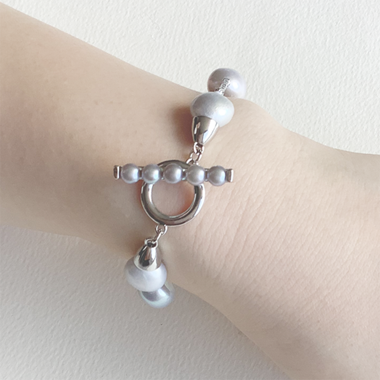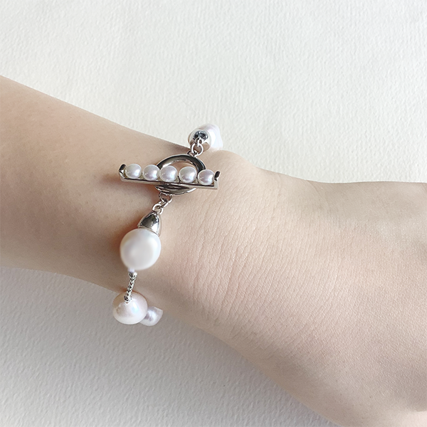 〇ステーションタイプのブレスレットはトレンドのトグルに淡水パールを使用した贅沢なブレスレット。
