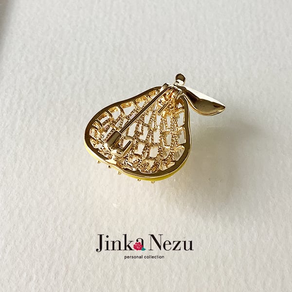 ラ・フランスをモチーフにした愛らしいデザインのブローチ。実の部分をキュービックジルコニアのテーパーカットを用いて、みずみずしいラ・フランスを表現しました