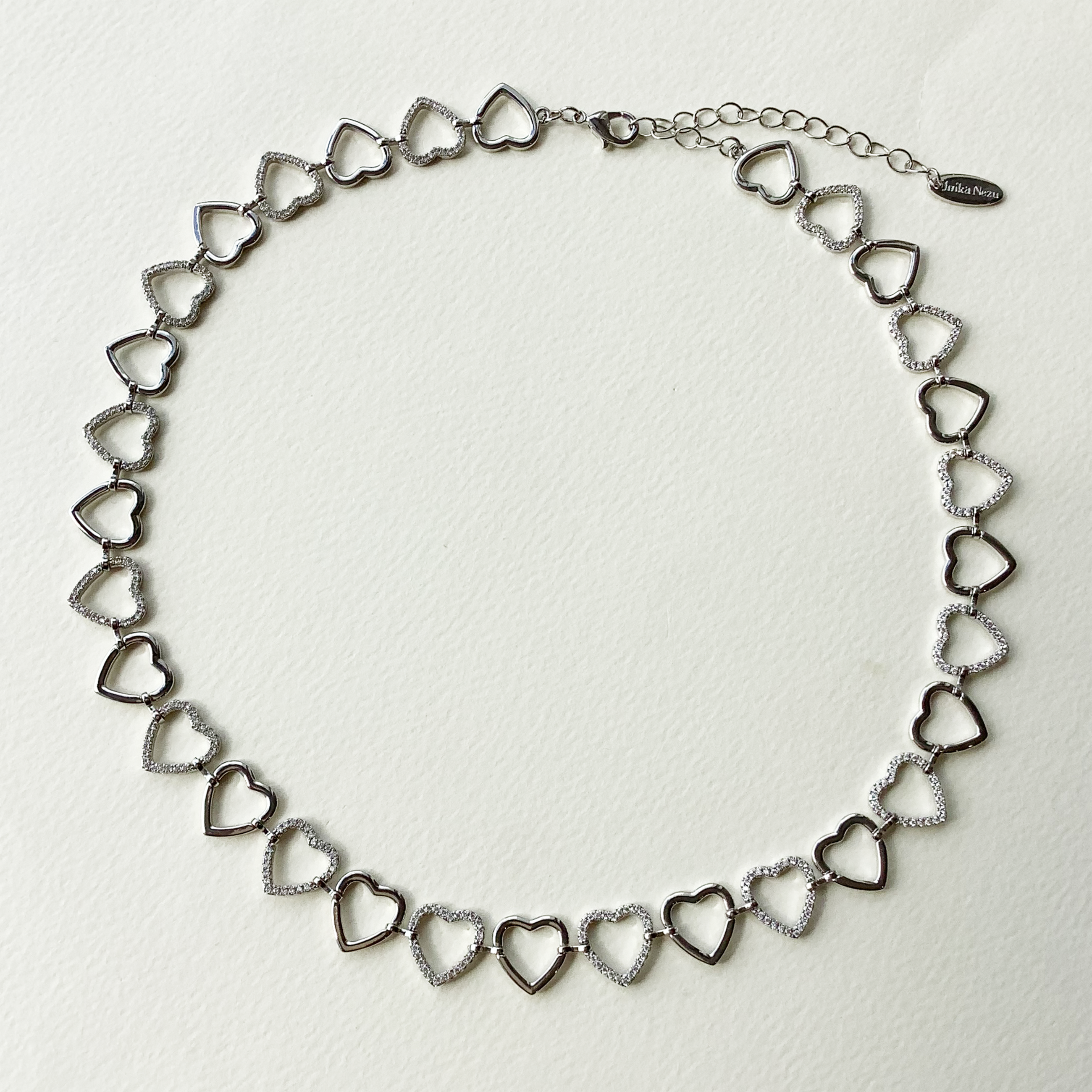 ハートモチーフをぐるっと一周連ねたチェーンネックレス。キュービックジルコニアをセットしたモチーフと鏡面のモチーフを交互に組合せた、シンプルでレースのようなデザインです